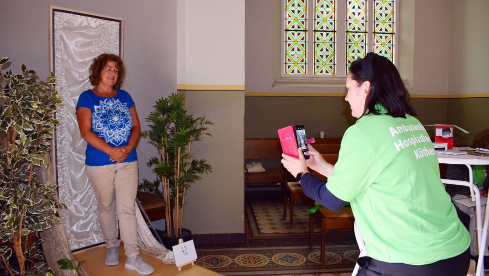 Ein ganz besonderer Hingucker und zugleich unser Fotomotiv war ein aufrechtstehender Sarg, den uns der Tischler Steffen Queitsch von der gleichnamigen Tischlerei zur Verfügung gestellt hatte. Diesen Sarg, gefertigt aus dem Holz des Blauglockenbaumes, stand auf einem großen Podest unmittelbar neben der Tür der Kapelle, so dass man ihn nicht gleich sah und beim Fotografieren auch nicht in Berührung mit ihm kam. Das besondere Fotomotiv war übrigens nur ein Angebot, wer es nicht nutzen wollte, musste dies natürlich auch nicht tun. Allerdings war auch zu beobachten, dass es einigen Gäste durch dieses Foto gelang, erste Barrieren gegenüber dem Thema Tod abzubauen.